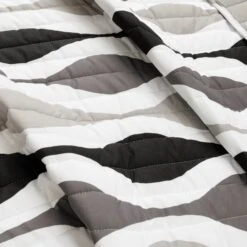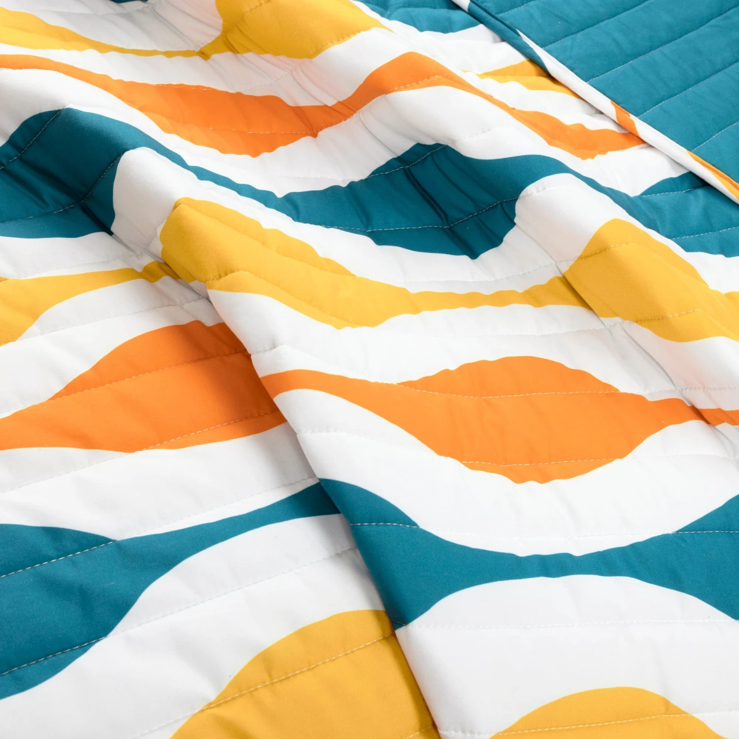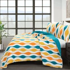 If you are embarking on a bedroom makeover, this Mid Century Geo Reversible Quilt 3 Piece Set will lay the foundation for a bold and exciting design. Each piece of this quilt set is decorated with this retro pattern of wavy colors.