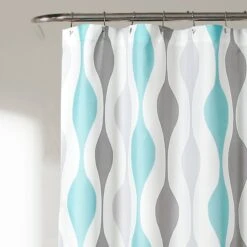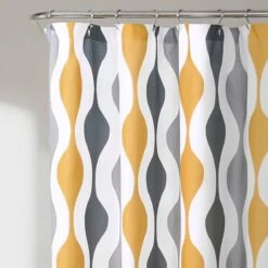 Available in your choice of light blue and gray; turquoise and orange; or gold and gray, the Mid Century Geo Shower Curtain measures 72 inches on each side. Its the perfect size for most standard bathtubs. It hangs easily with any shower curtain hooks or rings.