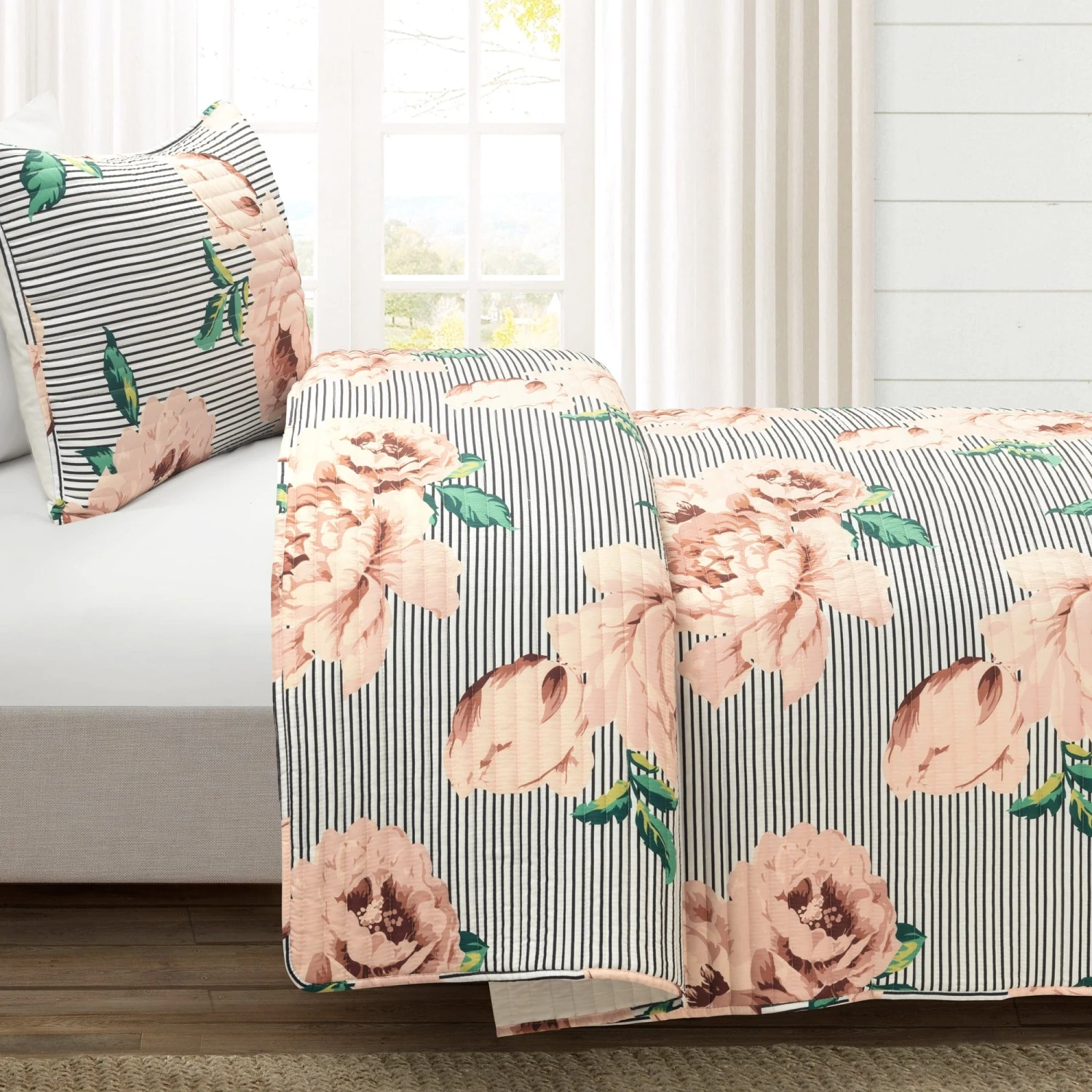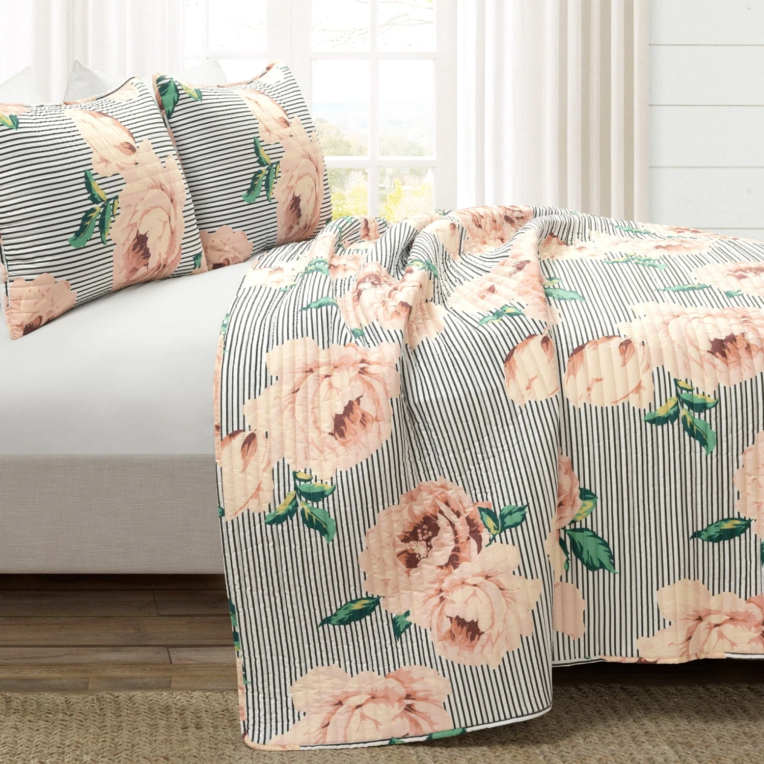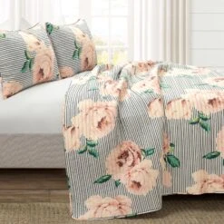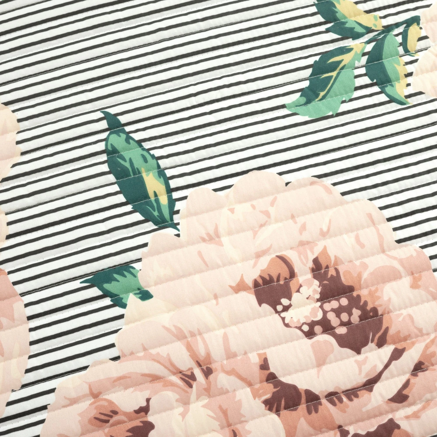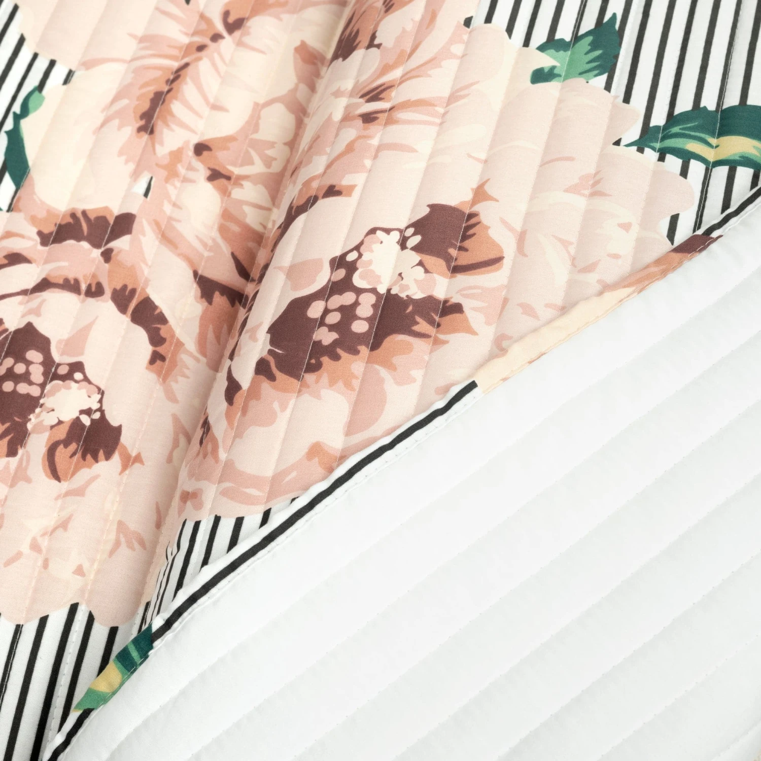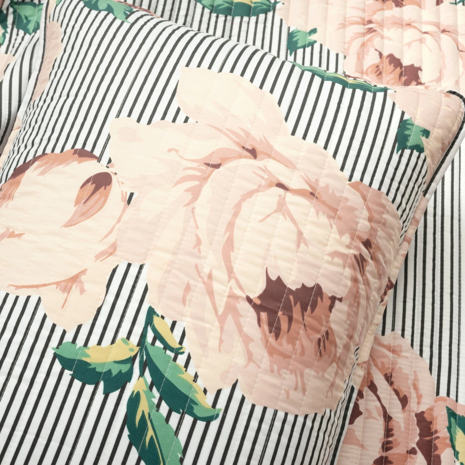 This is where chic meets vintage. This Mira Vintage Floral Oversized Quilt Set has the charm of a timeless floral style with a very trendy look and feel. The stripes catch the eye, but the bold look of the large flowers steal the show.