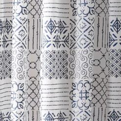 Our Monique Shower Curtain features a blue and white patchwork design of geometric patterns printed on microfiber. The look will help you bring farmhouse style to your primary or guest bathroom.