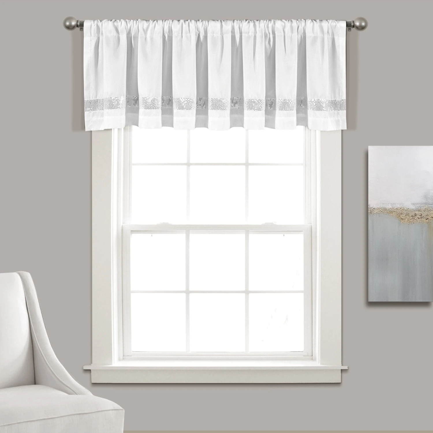 Shimmering light silver sequins combined with luxurious faux silk help to make this Night Sky Valance special both as a standalone window accent and when added to the coordinating window panels.