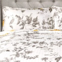 The soft grays and yellow tones of the Penrose Floral 3 Piece Quilt Set, combined with a peaceful pattern of thriving flowers and beautiful birds, create a beautiful image that helps to create a serene atmosphere perfect for sweet dreams and solid rest.