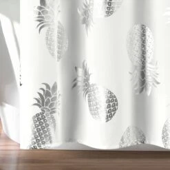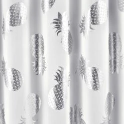 Make your bathroom pop with this stylish Pineapple Toss Shower Curtain featuring metallic printing on soft micro fiber. The gold or silver colored pineapples appear to be floating and tumbling through the air on this fashionable shower curtain perfect for young adults.