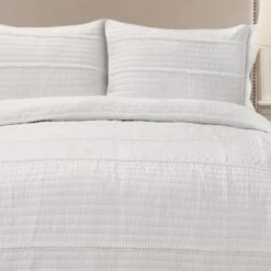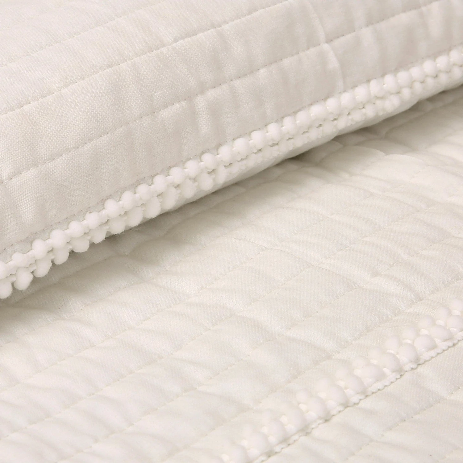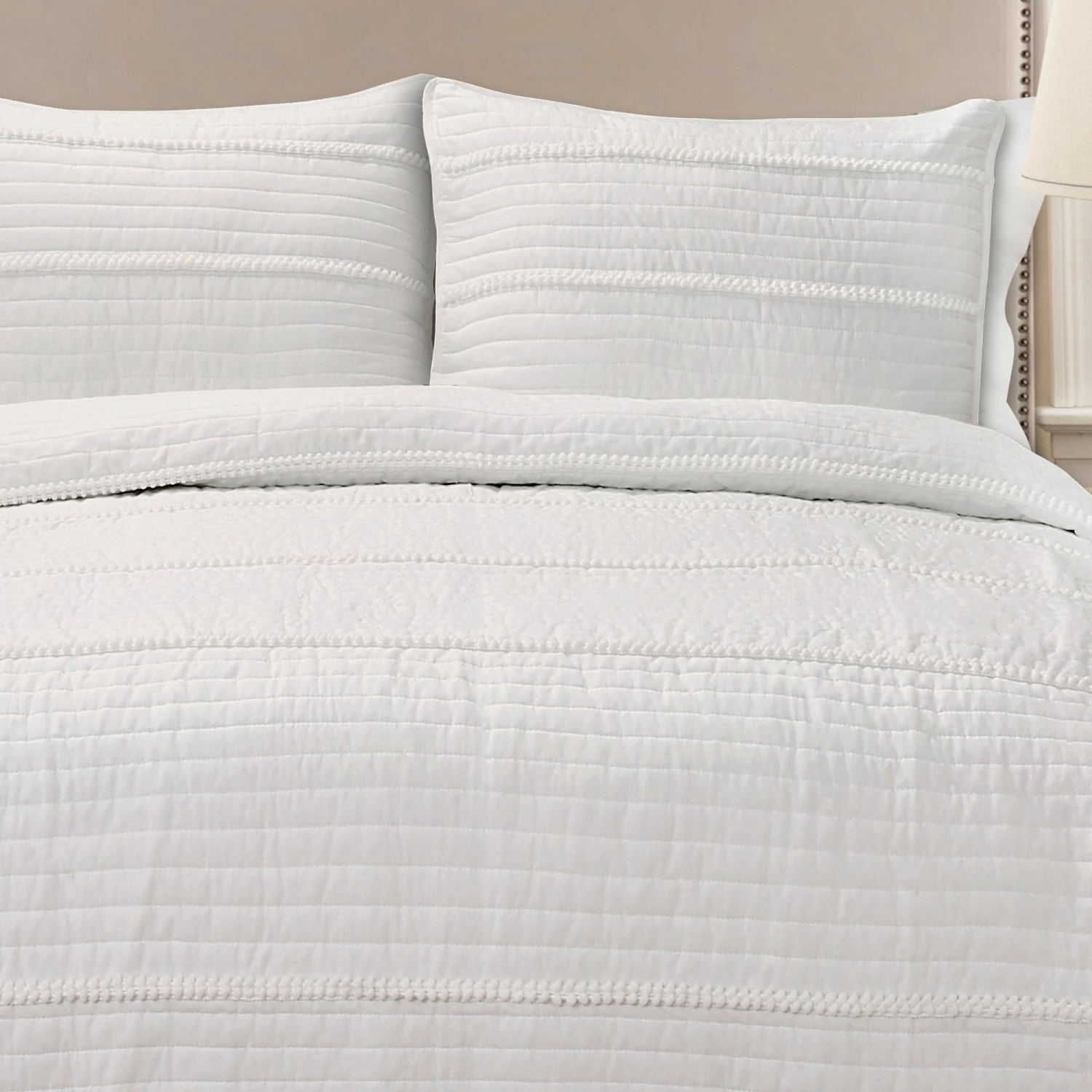 The Pom Pom Stripe Quilt 3 Piece Set includes a soft cotton quilt and two matching pillow shams. It is only available in white in your choice of Full/Queen or King Sizes.