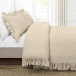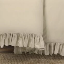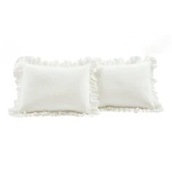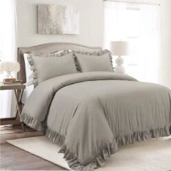 - Full/Queen: Duvet Cover: 90″H x 90″W + 4″ Ruffle; Pillow Shams: 20″H x 26″W + 2.5″ Ruffle