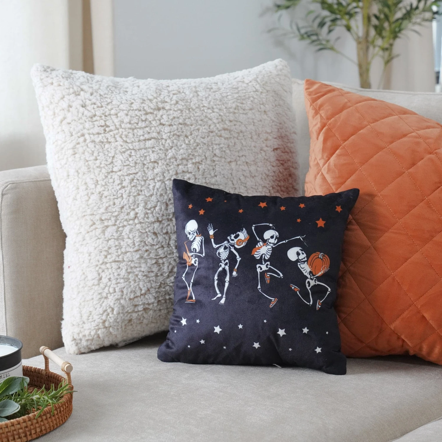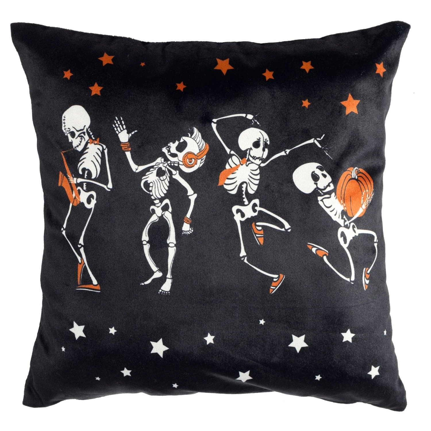 Bring some spooky fun to your decor with this Rocking Skeleton Decorative Pillow. With a festive Halloween look, this black, white and orange faux velvet pillow is perfect for adding some festive flair to your home. The graphic design is sure to get you and your guests in the Halloween spirit.