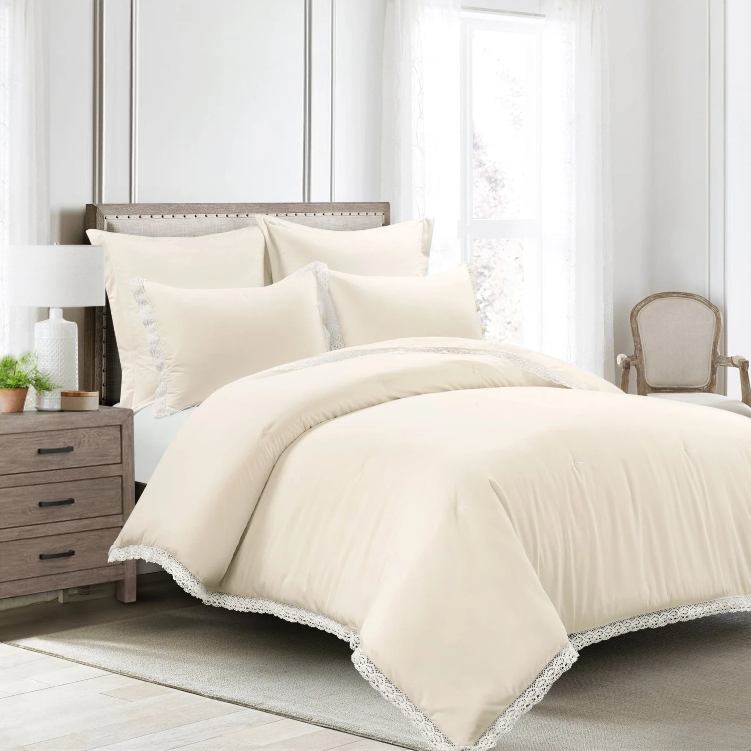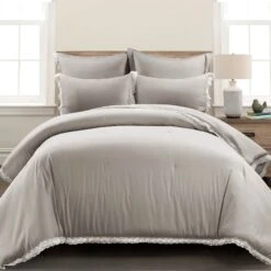 Wrap yourself up in ultimate comfort and warmth with this lovely Rosalie Cottagecore Lace Trim 5 Piece Comforter Set. This set includes one comforter, two shams and two euro shams. It is available in both King and Full/Queen sizes in four neutral options, including pure white, ivory, neutral, and light gray.