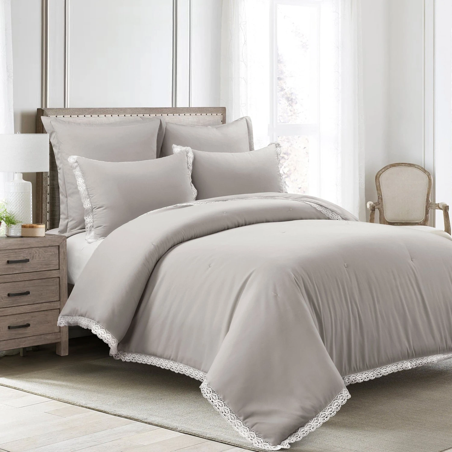 This charming Rosalie Cottagecore Lace Trim 5 Piece Comforter Set will add a touch of feminine style to your primary or guest bedroom makeover. The lace trim adds lovely flair to an otherwise minimalist look that can also fit into farmhouse, vintage charm, traditional, cottage or French Country themes.