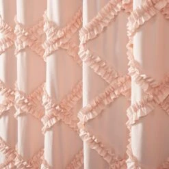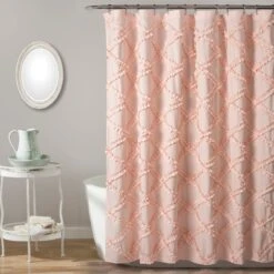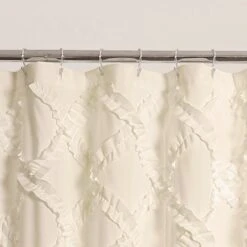 Measuring 72 inches wide by 72 inches tall, this Ruffle Diamond Shower Curtain is the perfect size for most any bath tub. You can choose from four neutral colors, including gray, white, blush or ivory. It easily hangs with any shower curtain rings or hooks.