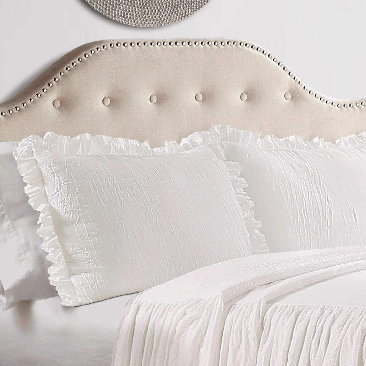 - California King: 84″H x 72″W + 30″ Drop; Shams: 20″H x 36″W + 2″ Ruffle