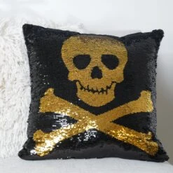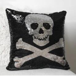 Add some Halloween spookiness to your decor. With its shimmering sequins and skull and crossbones design, this Skull And Crossbones Decorative Pillow is sure to add some Halloween spirit to your space. Whether you’re entertaining guests or just want something fun and festive, this pillow is a holiday must-have.