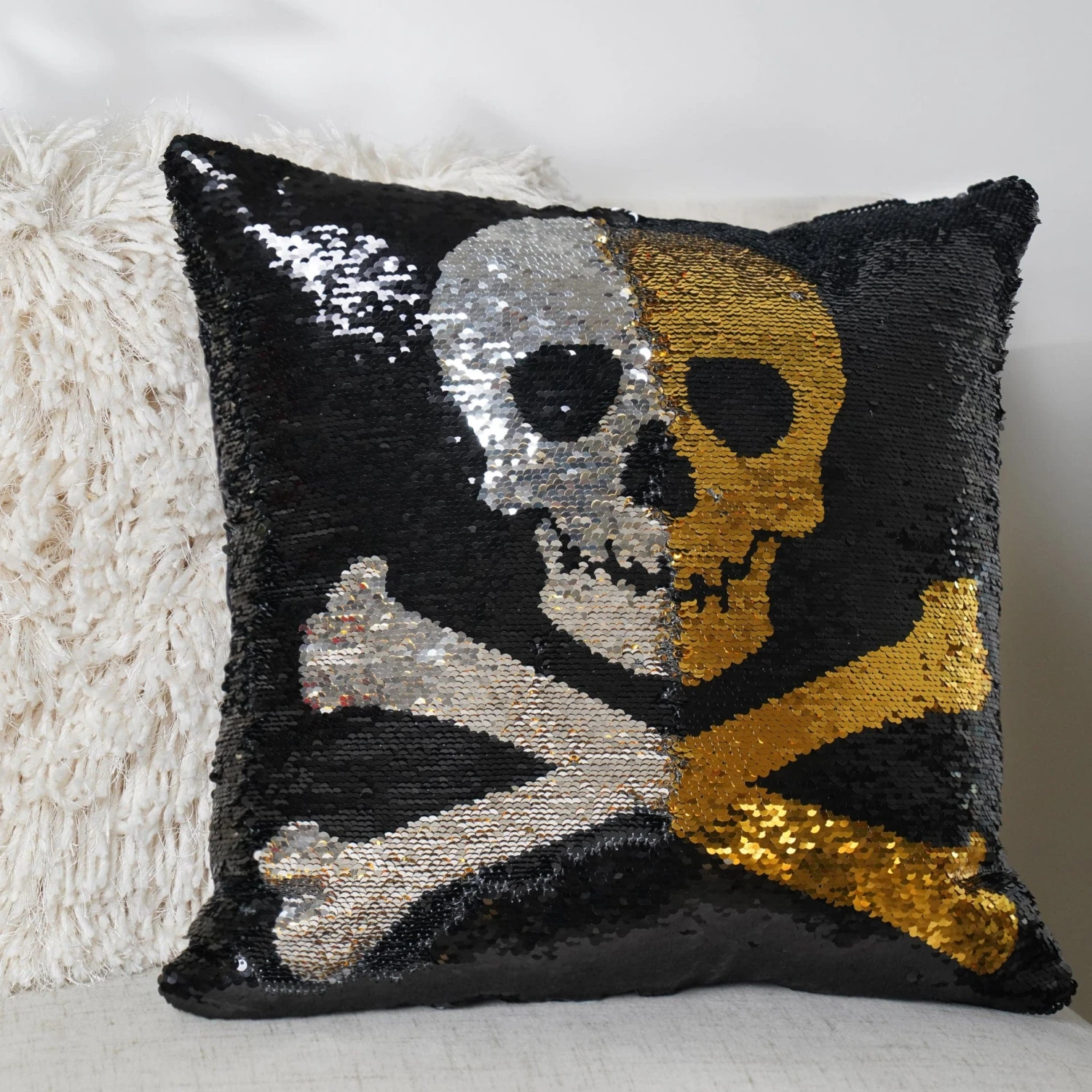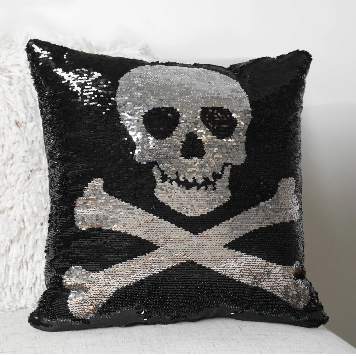 We mixed a pinch of glam with a little bit of Halloween spirit in our cauldron and came up with the perfect Halloween decorative accessory for your home! This Skull And Crossbones Decorative Pillow decorates your beautiful home for spooky season with black and gold sequins over a classic ghostly design.