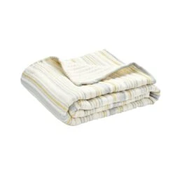 The Solange Stripe Kantha Pick Stitch Yarn Dyed Cotton Woven Throw measures 60 inches long by 50 inches wide. It’s the perfect size for a single adult to use as a blanket or for two adults to snuggle in together. It can also be used as the main blanket on a toddler’s bed.