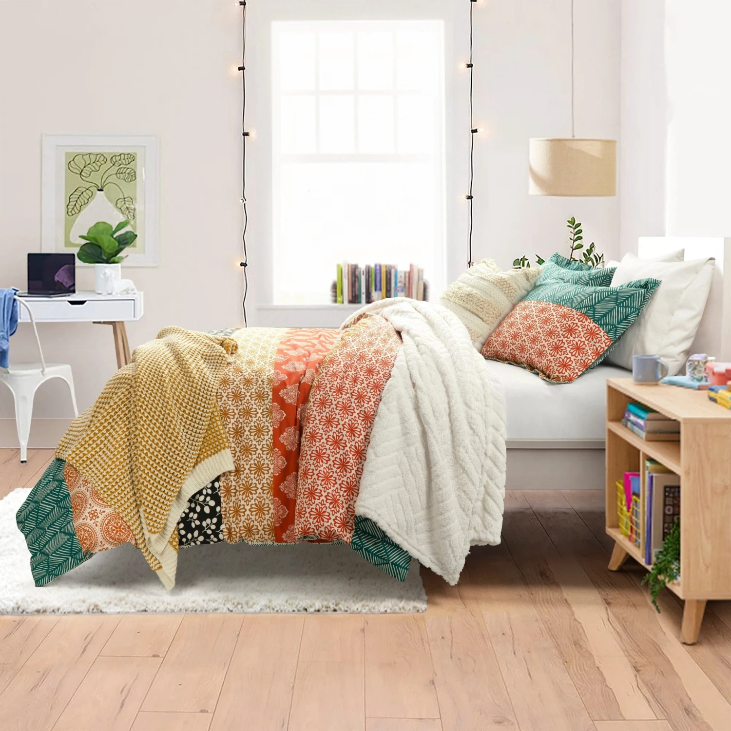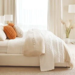 The Super Cozy Ultra Soft Sherpa Jacquard Geo Blanket/Bedspread measures 92 inches long and 120 inches wide. The simple yet stylish design make this blanket easy to fit into many decor themes from hygge to midcentury modern, minimalist and more.
