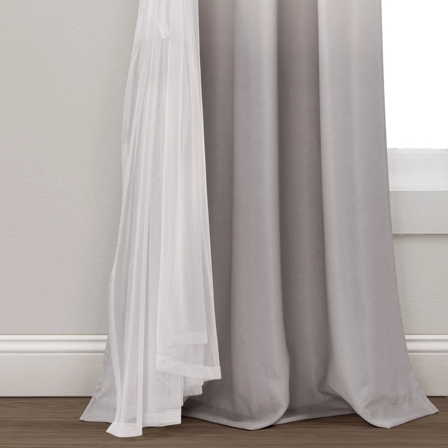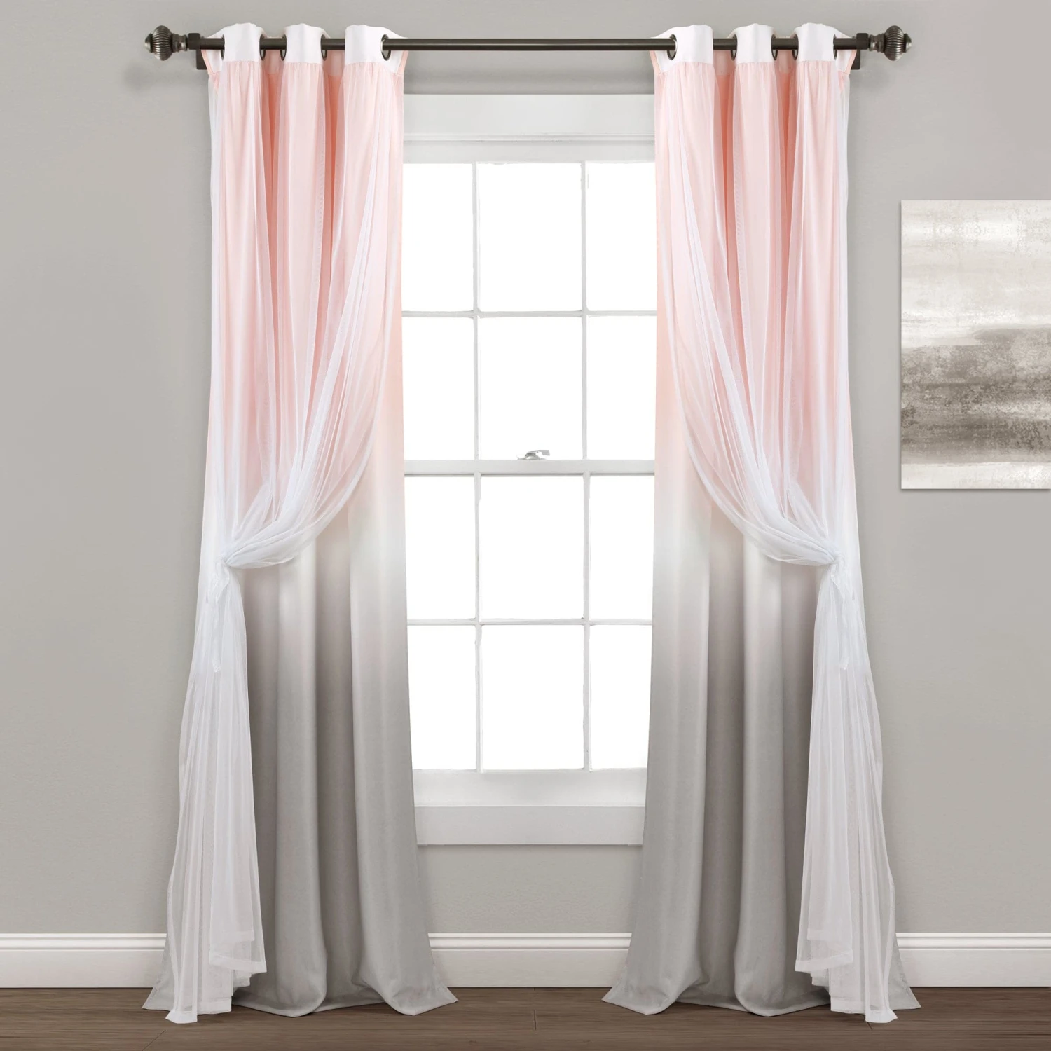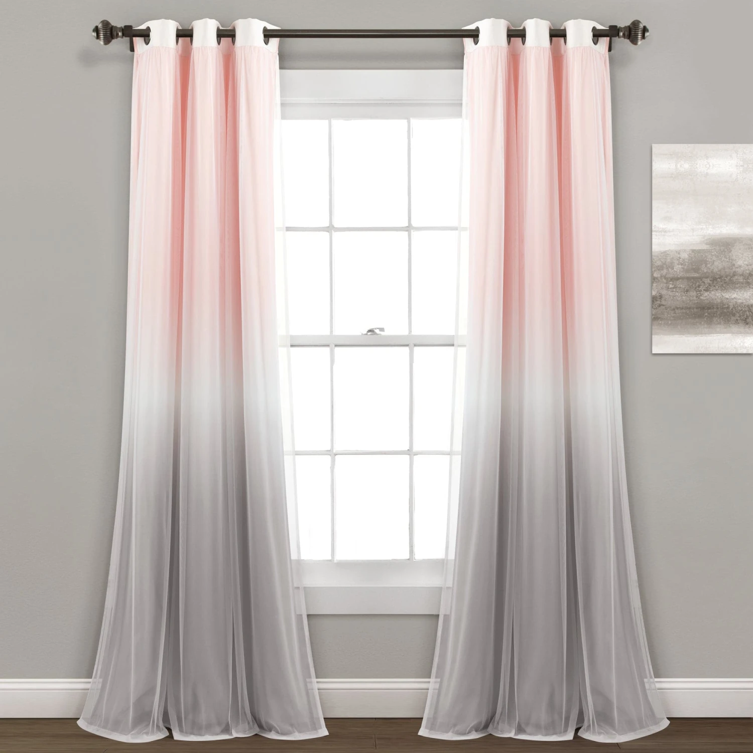 Our Umbre Fiesta Sheer/Light Filtering Window Curtain Panel is available in multiple color options, including yellow/gray and blush/gray. Each panel is 38 inches wide and 84 inches in length. This curtain style is sold by the single panel, so you will need to purchase two panels to get the look in the image.