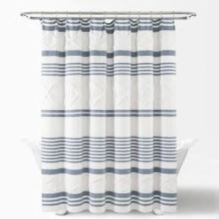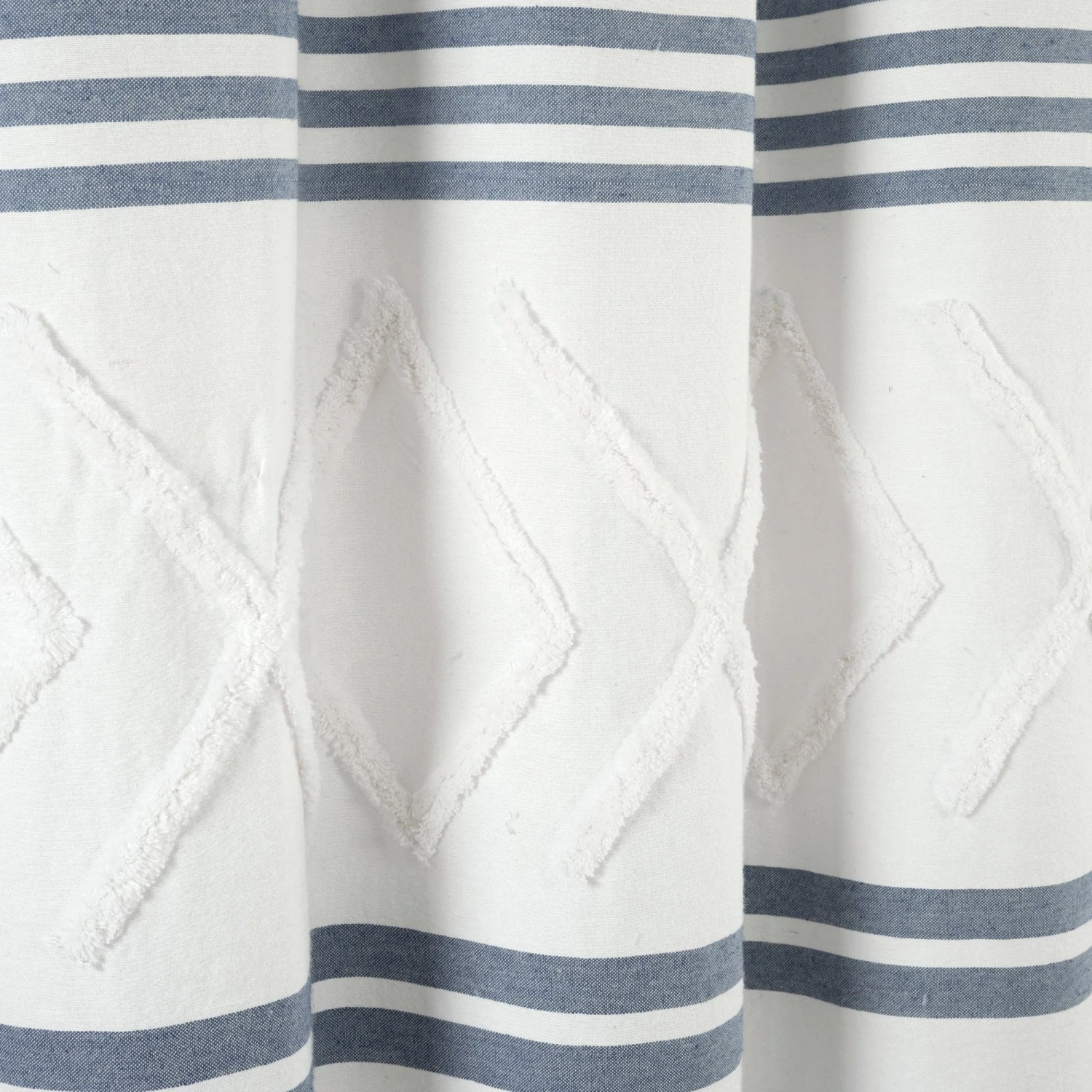 With a tufted diamond design and woven colored stripes, this Urban Diamond Stripe Woven Tufted Recycled Cotton Shower Curtain introduces a new take on a contemporary design by layering classic patterns with dimension. The yarn dyed fabric ensures long lasting color through use and wash.
