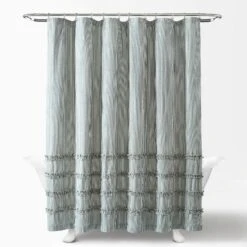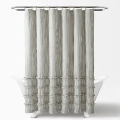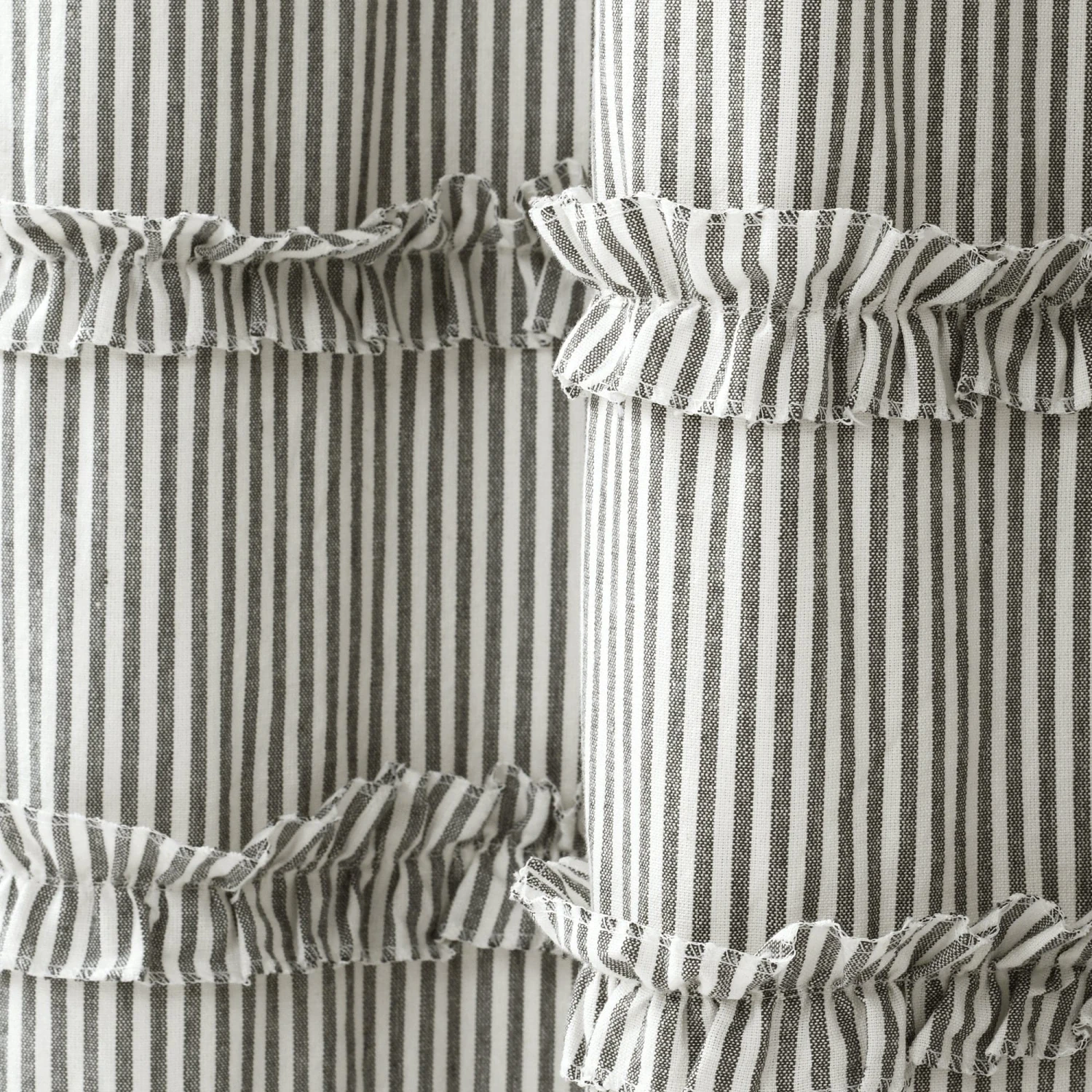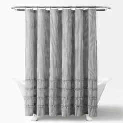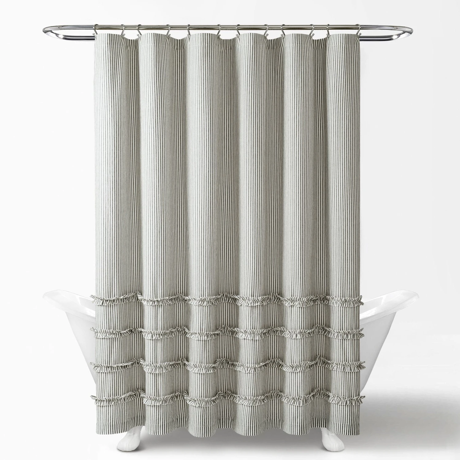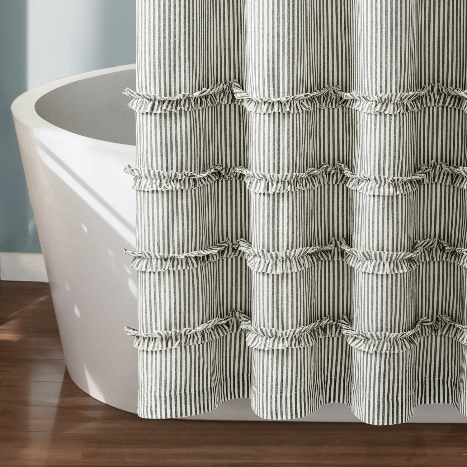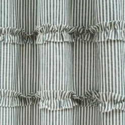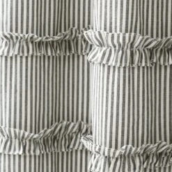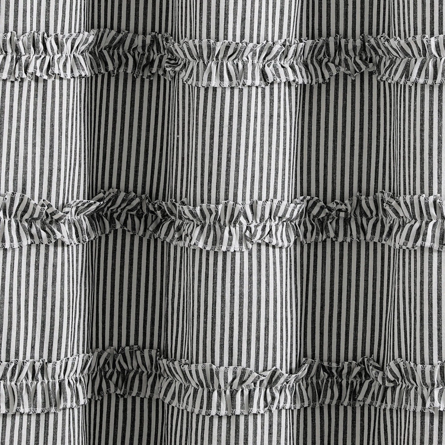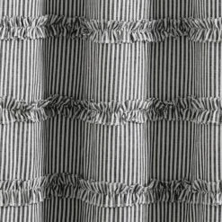 The texture created by horizontal rows of ruffled stripes against the printed vertical stripes adds a unique look to an otherwise minimalist shower curtain.