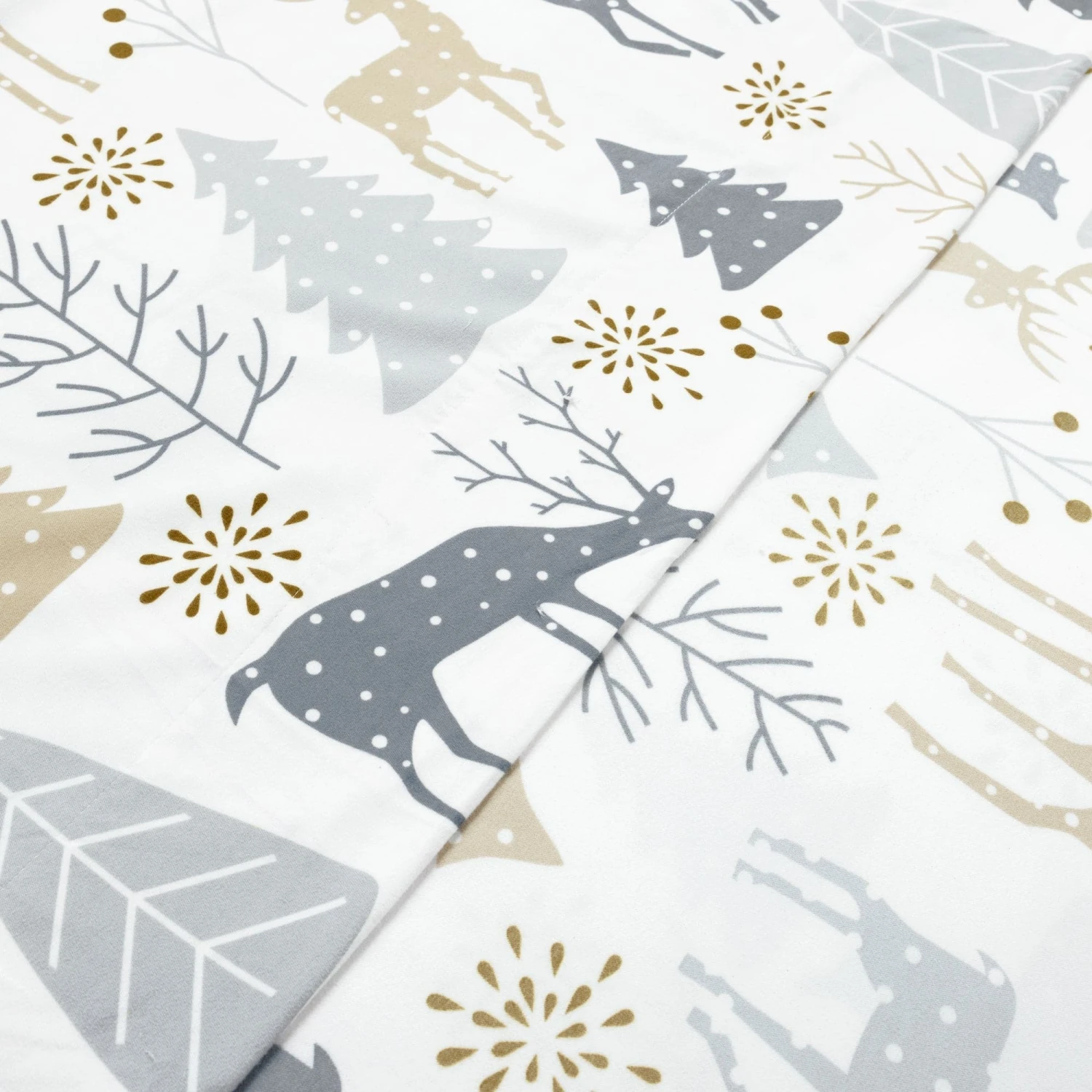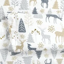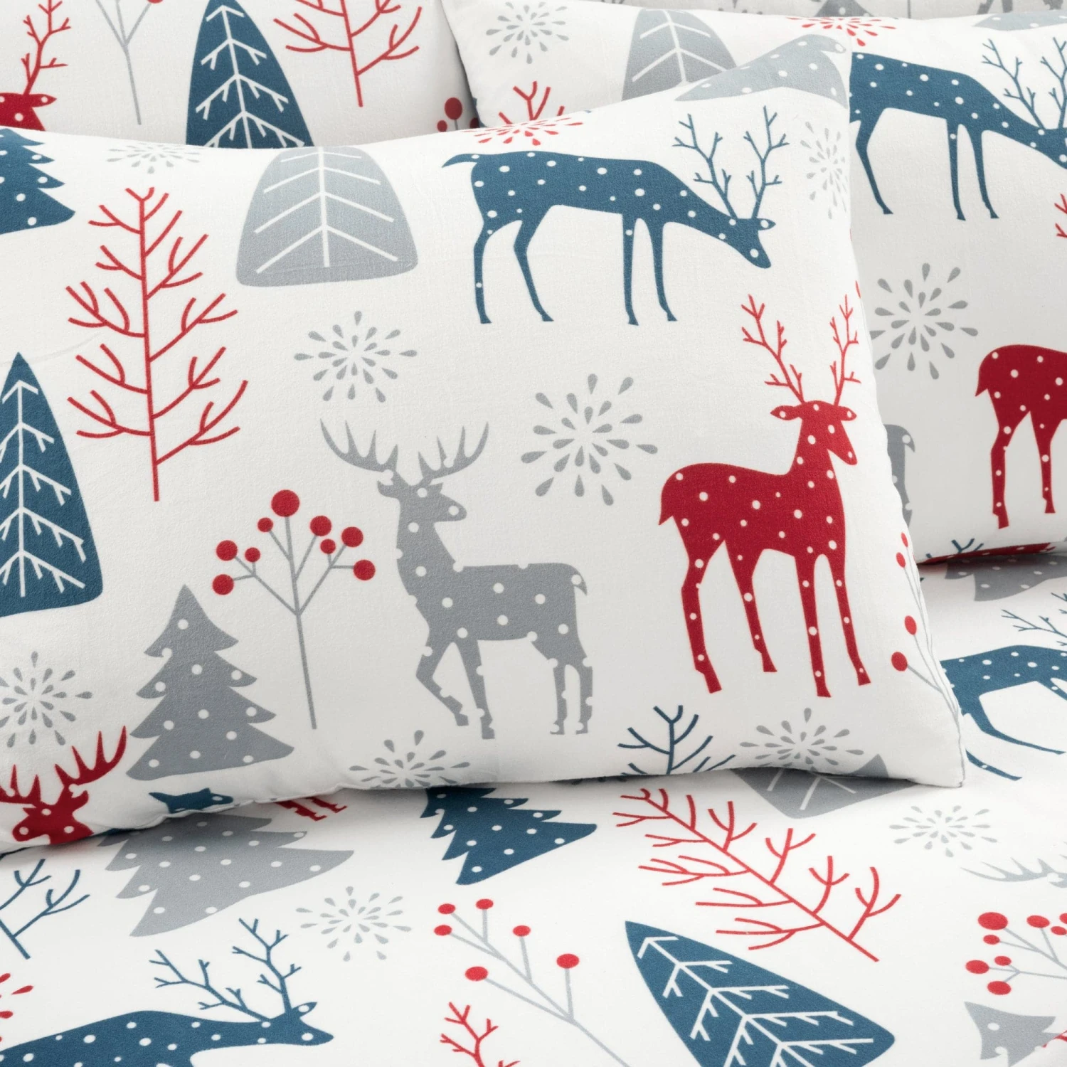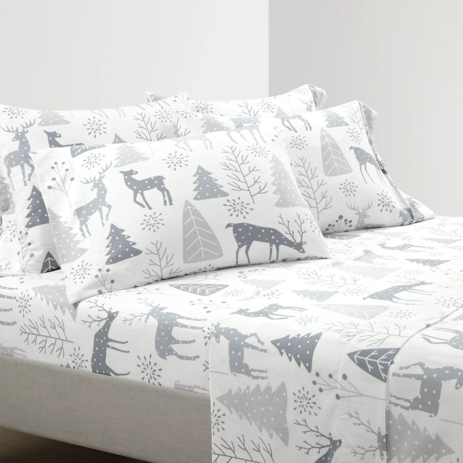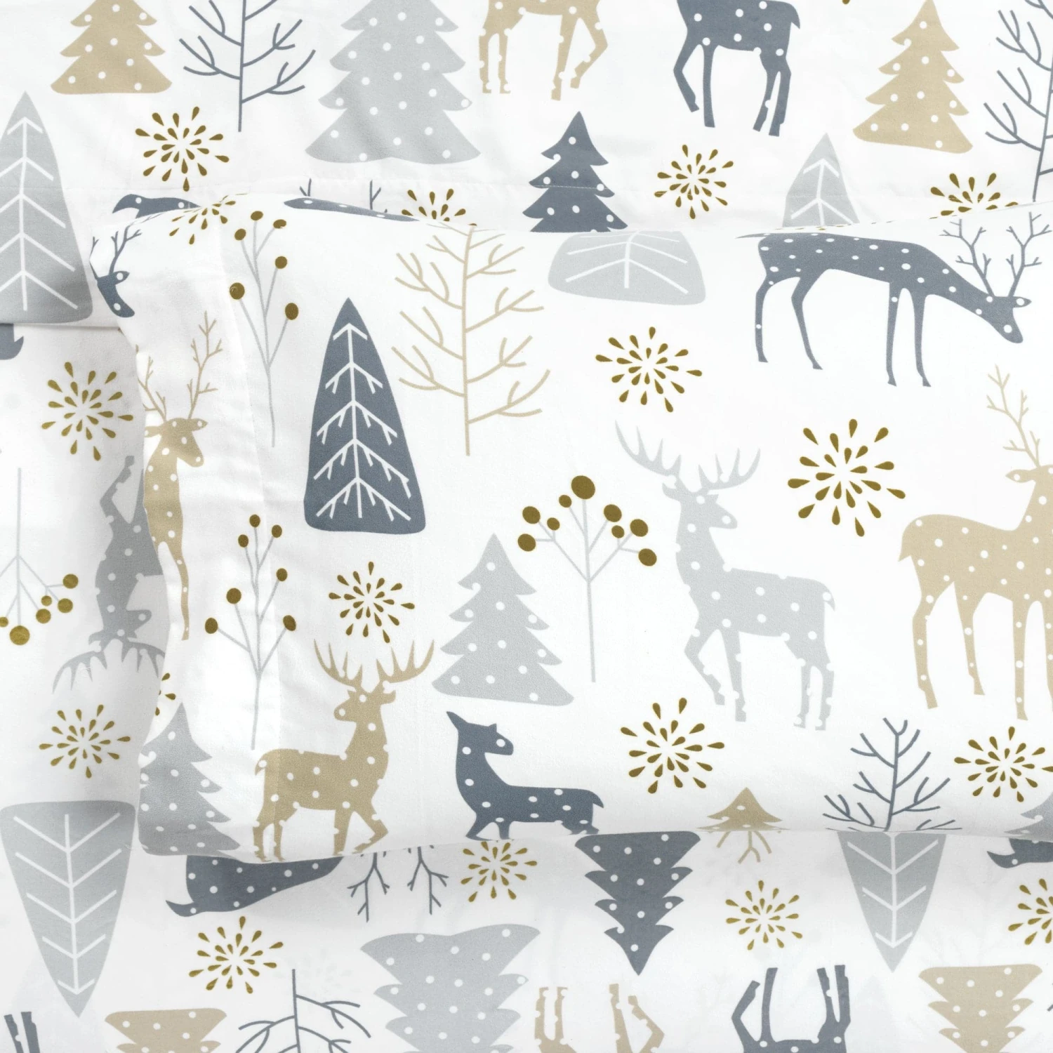 This festive super soft flannel sheet set will have you feeling comfy and cozy all winter long. Each piece of this Wonderland Soft Flannel Sheet Set is decorated with a pattern of traditional symbols of the season, such as evergreen trees, bare branches, falling snowflakes and deer.