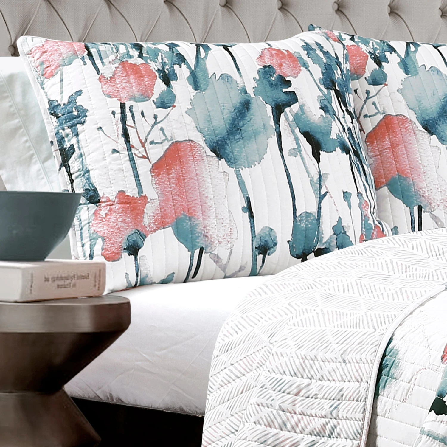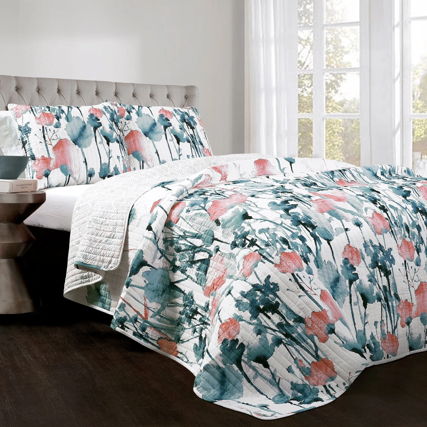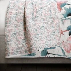 The reverse side of the Zuri Flora Quilt 3 Piece Set features a geometric print in soft coral and blue tones. The reversible nature of this quilt gives you the option to switch up the look of your room as often as you like simply by turning the quilt over to the other side.